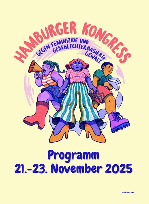 The Congress Against Femicide and Gender-Based Violence will take place from 21 to 23 November 2025 – the weekend before the International Day for the Elimination of Violence Against Women* (25 November) at the University of Hamburg (Von-Melle-Park 9) and the W3 Werkstatt für internationale Kultur und Politik e.V. in Altona (Nernstweg 32 - 34, 22765 Hamburg). The programme consists of various thematic focal points that shed light on the connections between gender-based violence, feminicide, social prevention, activism, research and justice. The three-day programme allows for an in-depth examination of the complexity and diversity of the topic. Conceptually, the programme is based on two central pillars of political education: informing and activating.